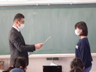 1月30日(月曜)全校朝会で、大田区小学校連合書初展に出展した作品児童の表彰がありました。