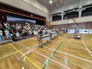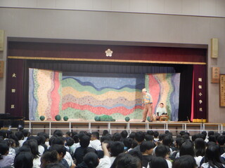 手拍子や歌を交えながら、時には児童席に近付いてくる等の迫力に子供達はぐっと惹きつけられていました。