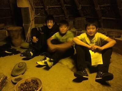 写真は館内を案内して頂いている様子と縦穴式住居の体験の様子です。