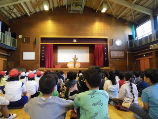 子供たちや教員も巻き込んで、パフォーマンスを披露していただいたり、夢をかなえることについて講演をしていただいたりしました。「どんなときでも好きなことを続けて夢を叶えてください」というケッチさんのメッセージを子供たちは真剣なまなざしで聞いていました。最後には、コミュニケーション講座として、パントマイムが上手にできるコツを教えていただきました。プロのパフォーマーに教えていただいたことは子供たちにとってとても貴重な経験になりました!