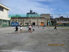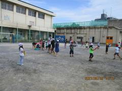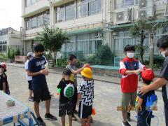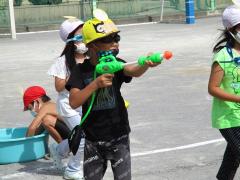 水鉄砲を持って来て、校庭でおもいっきり遊びました。前半は、金魚すくいで使うポイを頭に付けて、クラス対抗の試合、後半は、校庭全部を使っての自由遊びでした。中学生のボランティアの人たちも参加し、ポイを付けたり、重たいたらいの水を運んだりしてくれました。暑い夏休みも、これで少しは涼しくなったかな!?