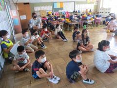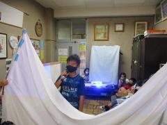 1学期最後のドキドキ集会です。ある物の影を見て、それが何か答えるシルエットクイズです。全部で10問とおまけの問題を、たてわり班で、よ~く見て、考えました。