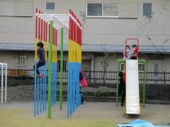 今日は、1組グループのたてわり班遊びです。校庭では、ドッジボール、だるまさんが転んだ、色おにをしていました。色おにをしている班では、カラフルな鉄棒、のぼり棒、すべり台、ジャングルジムが大活躍!体育館では、一面を使って、4班合同でドッジボールをしていました。