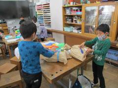紙をくしゃくしゃにして、ぎゅっとして、顔や体の形に整えます。そして、色画用紙やお花紙を使って飾り付けをしたら、思わずぎゅっとしたくなるような、すてきなお友達ができました!!