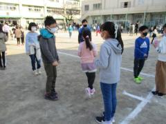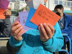 次に、ゲームです。1~5年生は、校庭の周りに立っている6年生の所へ行って、じゃんけんをします。6年生に買ったら、メッセージカードがもらえます。カードが4枚たまったら、ゴールです。メッセージカードには、6年生からみんなへ向けた、心あたたまるメッセージが書かれており、1~5年生は、喜んでいました。
