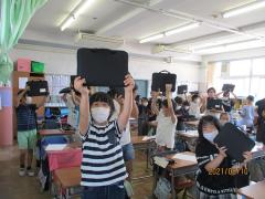 1人1台のタブレット。今日は、全校一斉に、タブレットを入れるケースを配りました。登下校の際は、タブレットをケースに入れ、ケースごとランドセルに入れます。学校にいる間は、ランドセルからケースのまま取り出し、机の横のフックにかけます。