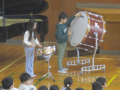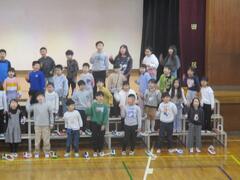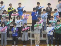 先日の音楽朝会は、2年生の合奏と合唱を全校児童の前で披露しました。当日は、朝早くから多くの保護者の皆様にも、ご覧いただきありがとうございました。 合唱「あおいそらに えをかこう」、元気な歌声と「えいやー」の掛け声を響かせました。合奏「山のポルカ」は鍵盤ハーモニカで音の呼びかけあい、聞いている人が楽しくなるような演奏を心掛けました。 音楽朝会が終わった後には、「緊張したけど楽しかった」「またやりたい」など充実した表情をうかべていました。