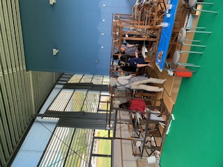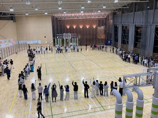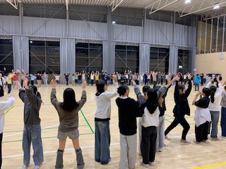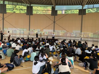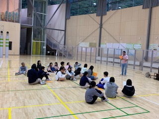 霧雨のようだった雨が強くなってきてしまい、体育館でのゲームに変更 レクリエーション係の皆さん、ありがとうございました。