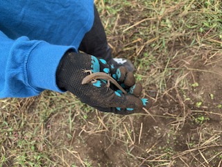 農家の方からお話を聞いて みんなでジャガイモの収穫 かわいいカナヘビも獲れました。