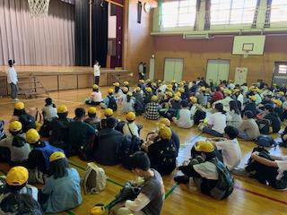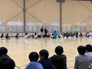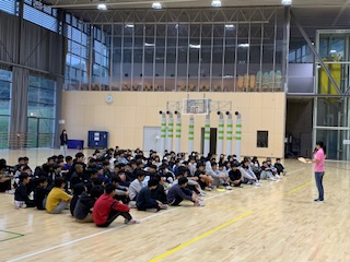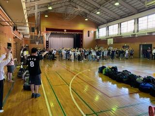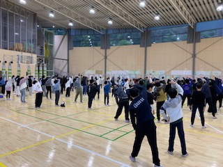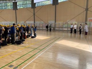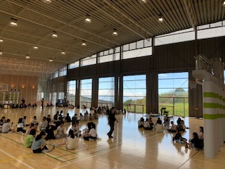 朝会は体育館。 ラジオ体操で体を動かすと、しっかり目が覚めてきたようです。