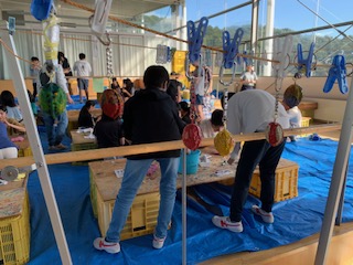 2日目の朝食はメバルの塩焼きに信州野菜のお浸し 。みんなで手分けして準備します。