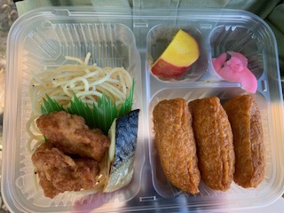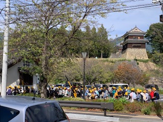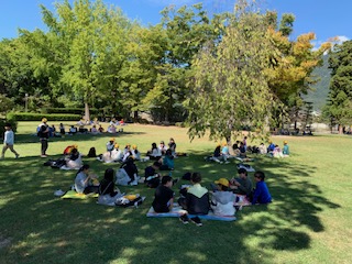 移動教室最後の昼食は稲荷寿司弁当。 真田氏で有名な上田城跡の公園でいただきます。