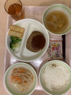 1日目の夕食はハンバーグに田舎汁。 とても手際よく配膳できました 。みんな揃っていただきます。