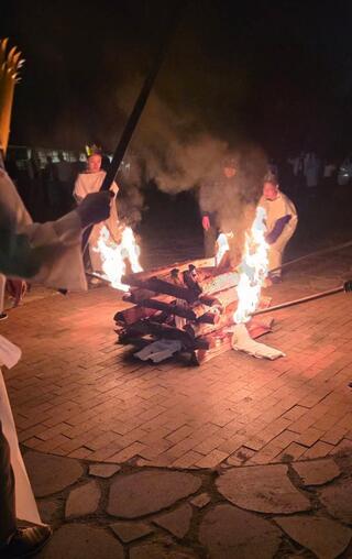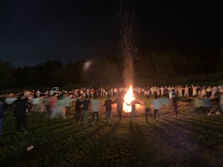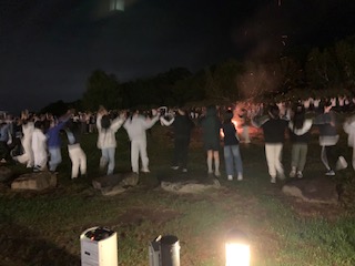 夕食後は、念願の大きな火を囲んだキャンプファイヤー。 マイムマイムに思い出のエイサーと盛り上がったのですが