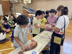 天然と養殖の鯛の実物を見比べる体験、一本釣りの竿を触る体験、教科書では学ぶことのできない体験学習ができました。