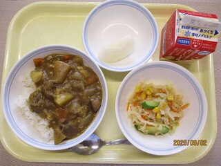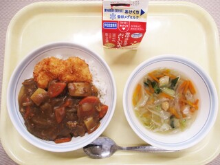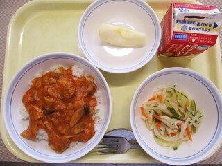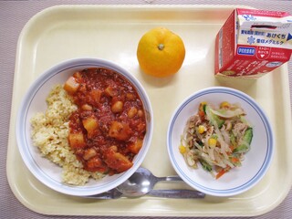 チキンカレーライス・牛乳・ツナサラダ・くだもの(梨)