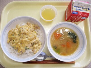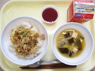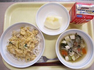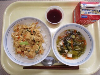 高野豆腐の肉みそ丼・牛乳・めかたま汁・くだもの(りんご)