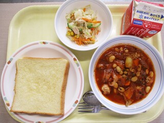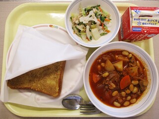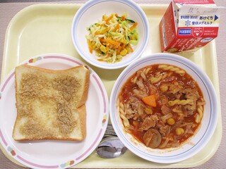 ごまトースト・牛乳・豆とマカロニのトマトシチュー・キャロットドレッシングサラダ
