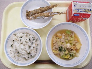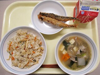 切干大根ごはん・牛乳・ししゃものごまフライ・豚汁