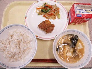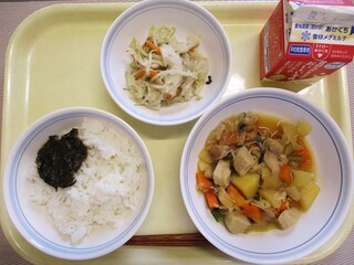 ごはん・のりとひじきの佃煮・牛乳・鶏肉と高野豆腐のうま煮・ちくわと野菜のみそドレ和え