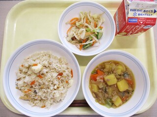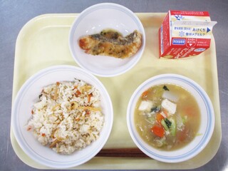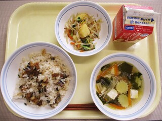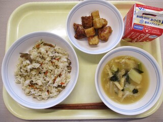 鶏肉とごぼうのごはん・牛乳・豚肉と高野豆腐の甘辛揚げ・みそ汁