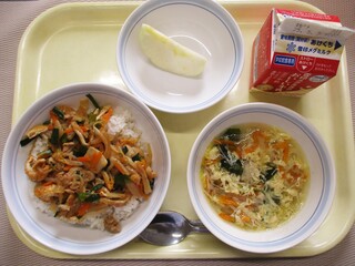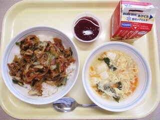 豚キムチ丼・牛乳・卵とわかめのスープ・くだもの(りんご)