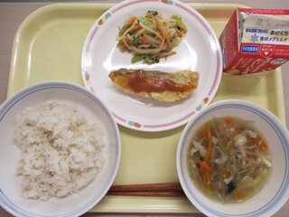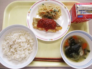 麦ごはん・牛乳・魚のチリソースがけ・春雨の炒め物・わかめスープ