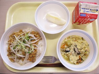 大豆ときのこのそぼろ丼・牛乳・じゃがいもと野菜の昆布和え・むらくも汁