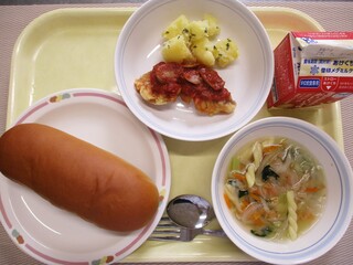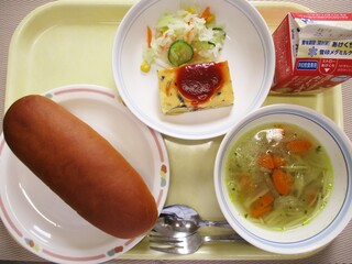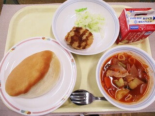 柏パン・牛乳・チーズコロッケ・ゆでキャベツ・レンズ豆のトマトスープ