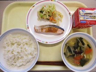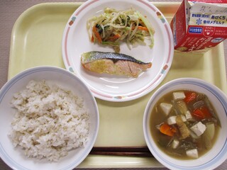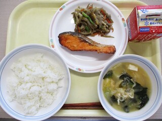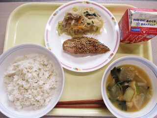 麦ごはん・牛乳・鮭の南部焼き・春雨の炒め物・みそ汁