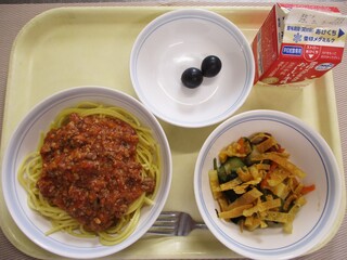 スパゲティきのこミートソース・牛乳・パリパリ海藻サラダ・くだもの(巨峰)