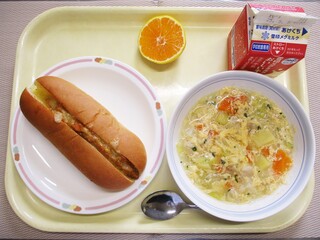 カレーミートドッグ・牛乳・洋風卵スープ・菊花みかん