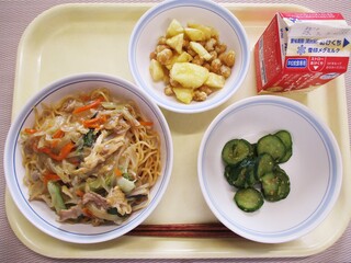 あんかけ焼きそば・牛乳・きゅうりの中華風味・カレービーンズポテト