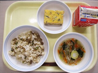 豚肉のしぐれごはん・牛乳・ふくさ卵・すまし汁
