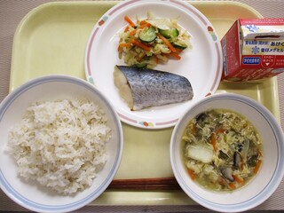 麦ごはん・牛乳・魚の塩こうじ焼き・切干大根の和え物・めかたま汁