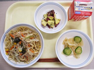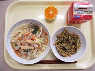 五目うどん・牛乳・さつまいもとコーンのかき揚げ・くだもの