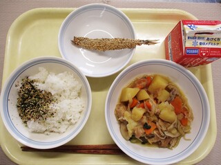 ごはん・ゆかりふりかけ・牛乳・肉じゃが煮・ししゃものごま焼き
