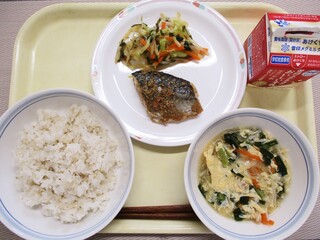 麦ごはん・牛乳・魚のごまみそ焼き・野菜の磯和え・にらたま汁
