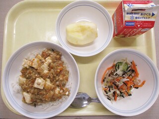 麻婆豆腐丼・牛乳・ツナひじきサラダ・くだもの(りんご)