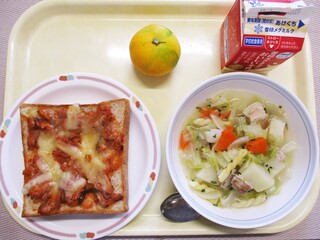 ツナピザトースト・牛乳・ポトフ・くだもの(みかん)