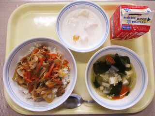 焼肉丼・牛乳・わかめと豆腐のスープ・フルーツのヨーグルト和え