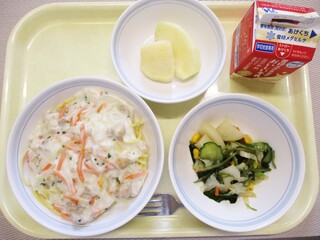 クリームソーススパゲティ・牛乳・海藻サラダ・くだもの(2種類のりんごの食べ比べ)