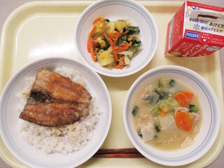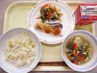 もちきびごはん・牛乳・魚の照り焼き・野菜の昆布和え・田舎汁