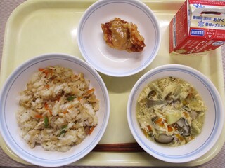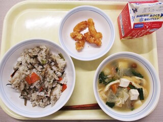 吹き寄せごはん・牛乳・いかのかりんと揚げ・田舎汁