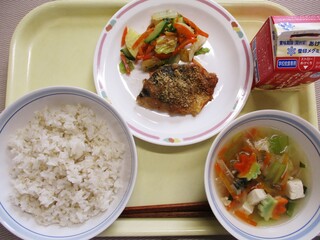 麦ごはん・牛乳・魚のごまみそ焼き・野菜の昆布和え・すまし汁