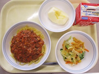 スパゲティきのこミートソース・牛乳・パリパリハニーサラダ・くだもの(りんご)