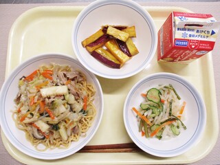 海鮮あんかけ焼きそば・牛乳・大根サラダ・キャンディポテト