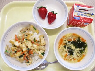 ジャージャン豆腐ごはん・牛乳・わかめと卵のスープ・くだもの