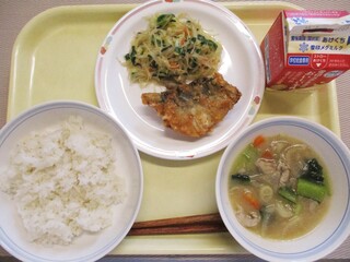 麦ごはん・牛乳・揚げ魚のみそだれ・野菜のごま和え・沢煮椀