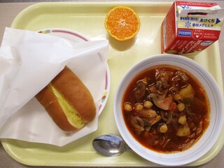 チリビーンズドッグ・牛乳・冬野菜のポトフ・くだもの